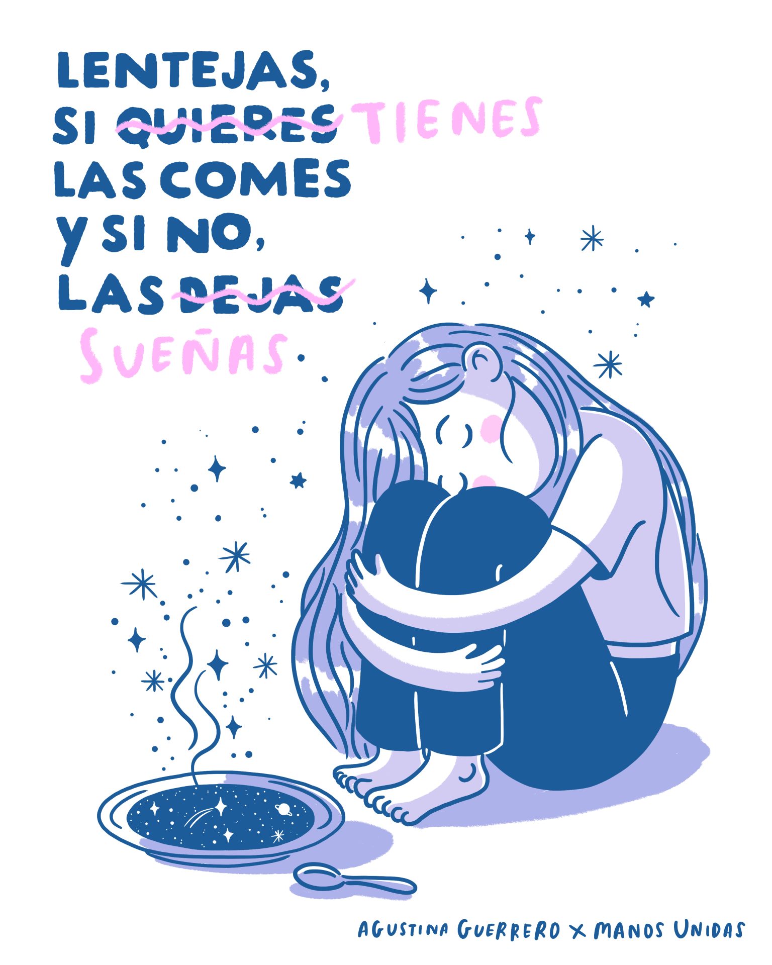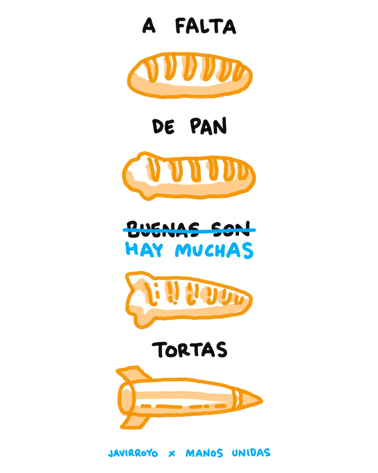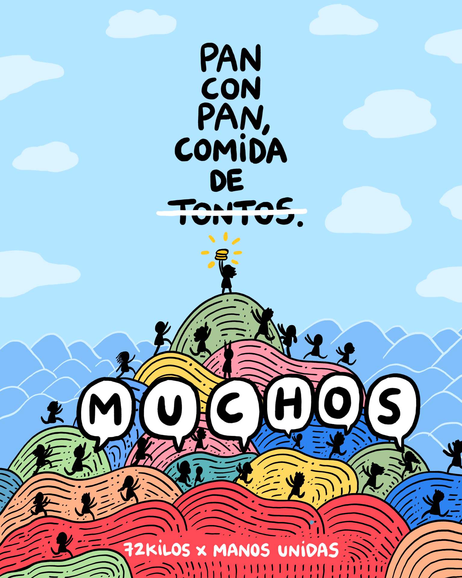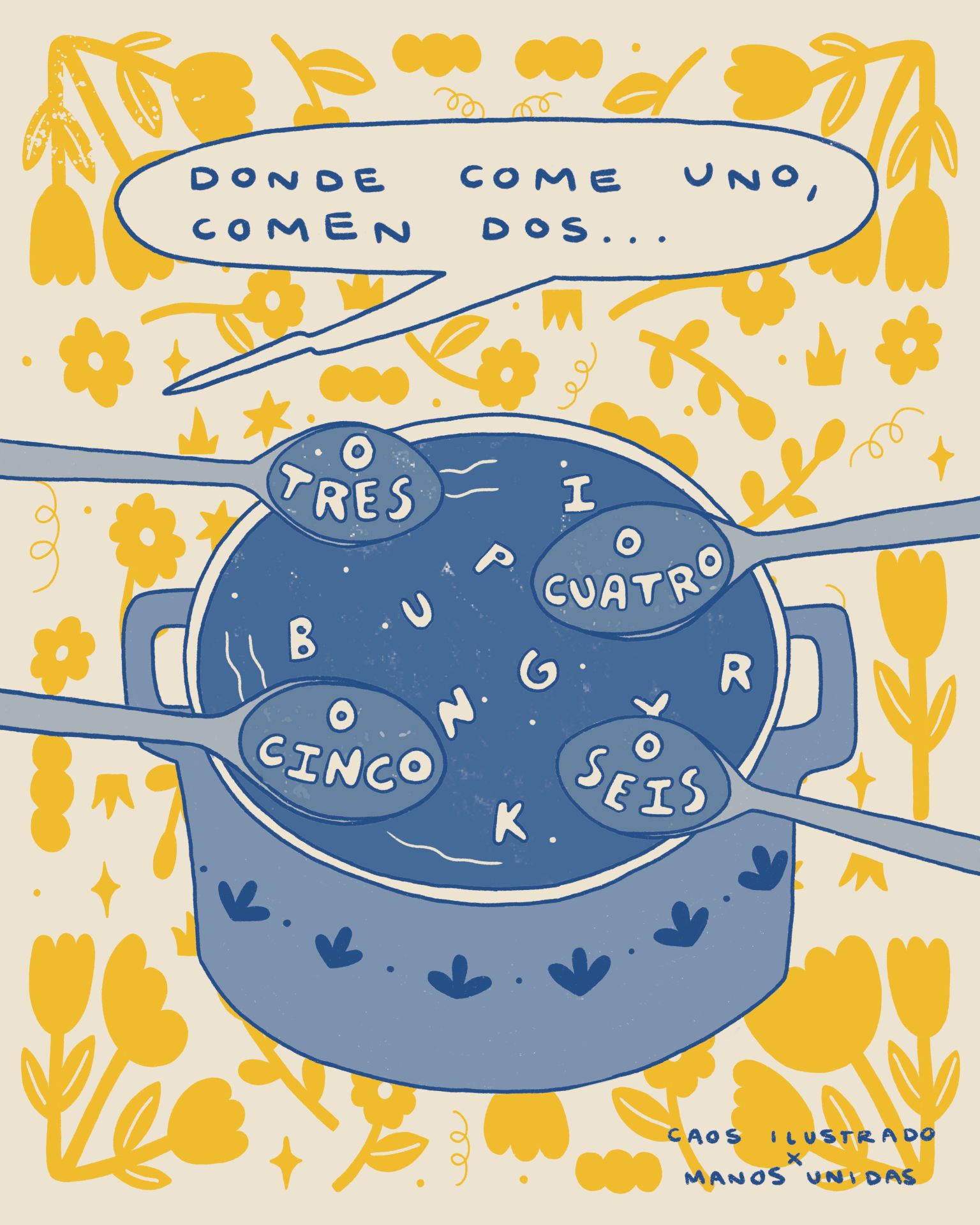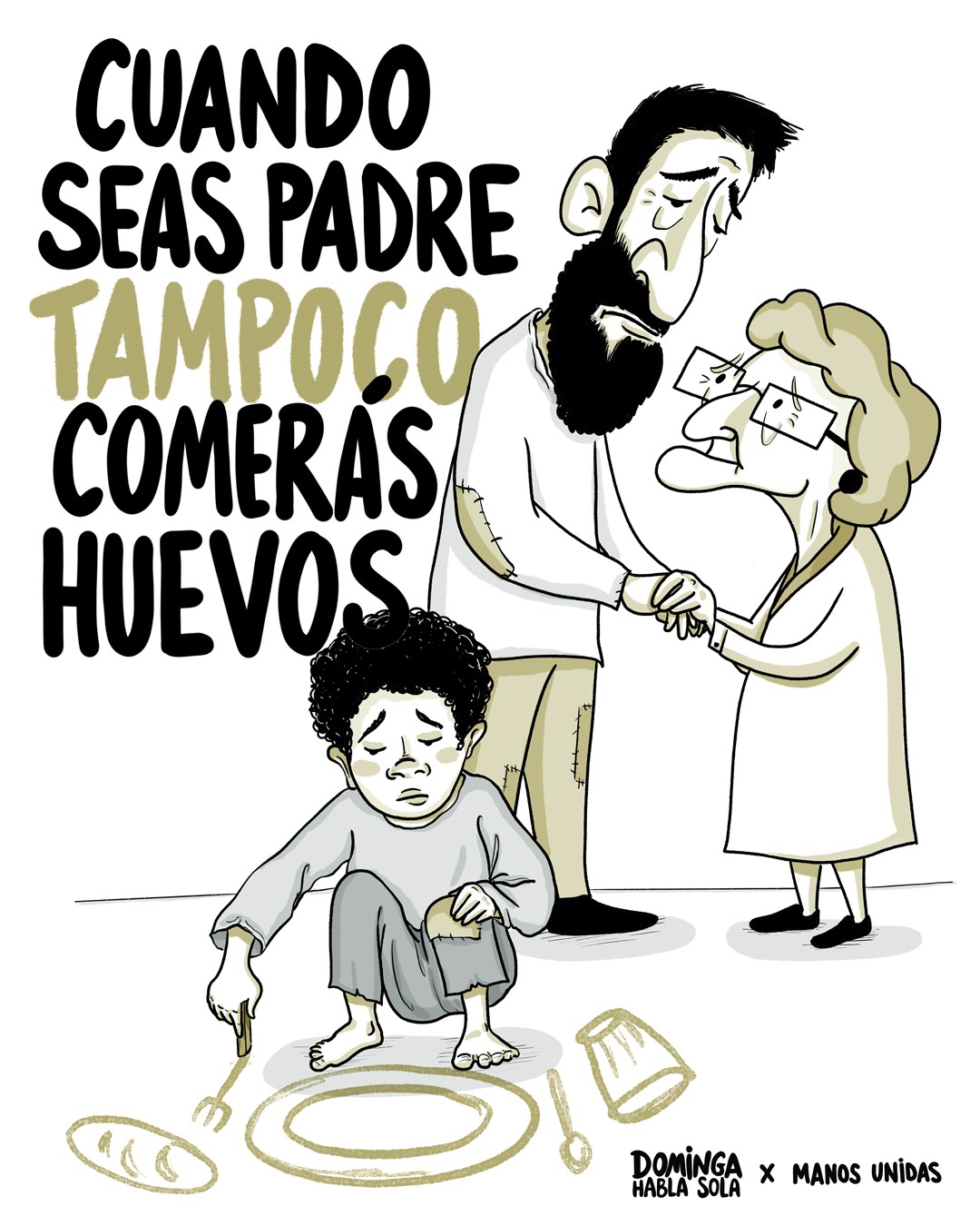 Además, Manos Unidas también ha colaborado con los ilustradores 72kilos, Javirroyo, Caos Ilustrado, Dominga Habla Sola y Agustina Guerrero. Éstos han creado distintas gráficas que reinventan versionan los refranes para sensibilizar acerca del hambre. Éstas no sólo conciencian sobre la problemática, sino que también invitan a reflexionar acerca de sus causas estructurales y las consecuencias que provoca. Así, las ilustraciones no sólo señalan la falta de comida, sino que también abordan cuestiones como la guerra, la desigualdad, la injusticia, la migración o la sanidad.