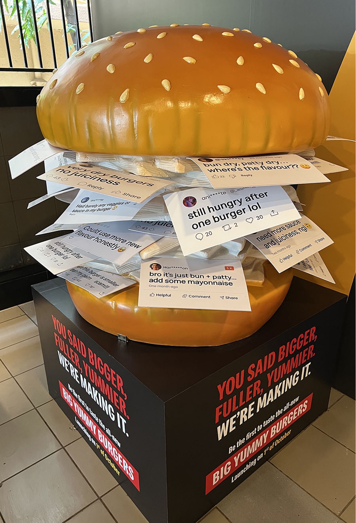 La campaña se ha extendido más allá del entorno audiovisual con una serie de activaciones. Entre ellas, las instalaciones 3D de Comment Burgers en ubicaciones de alto tránsito en Mumbai y Bangalore. Estas esculturas a gran escala replican hamburguesas gigantes que, en lugar de ingredientes, contienen comentarios reales de clientes impresos entre los panes, con el fin de hacer tangible el diálogo entre marca y consumidor en el espacio público.