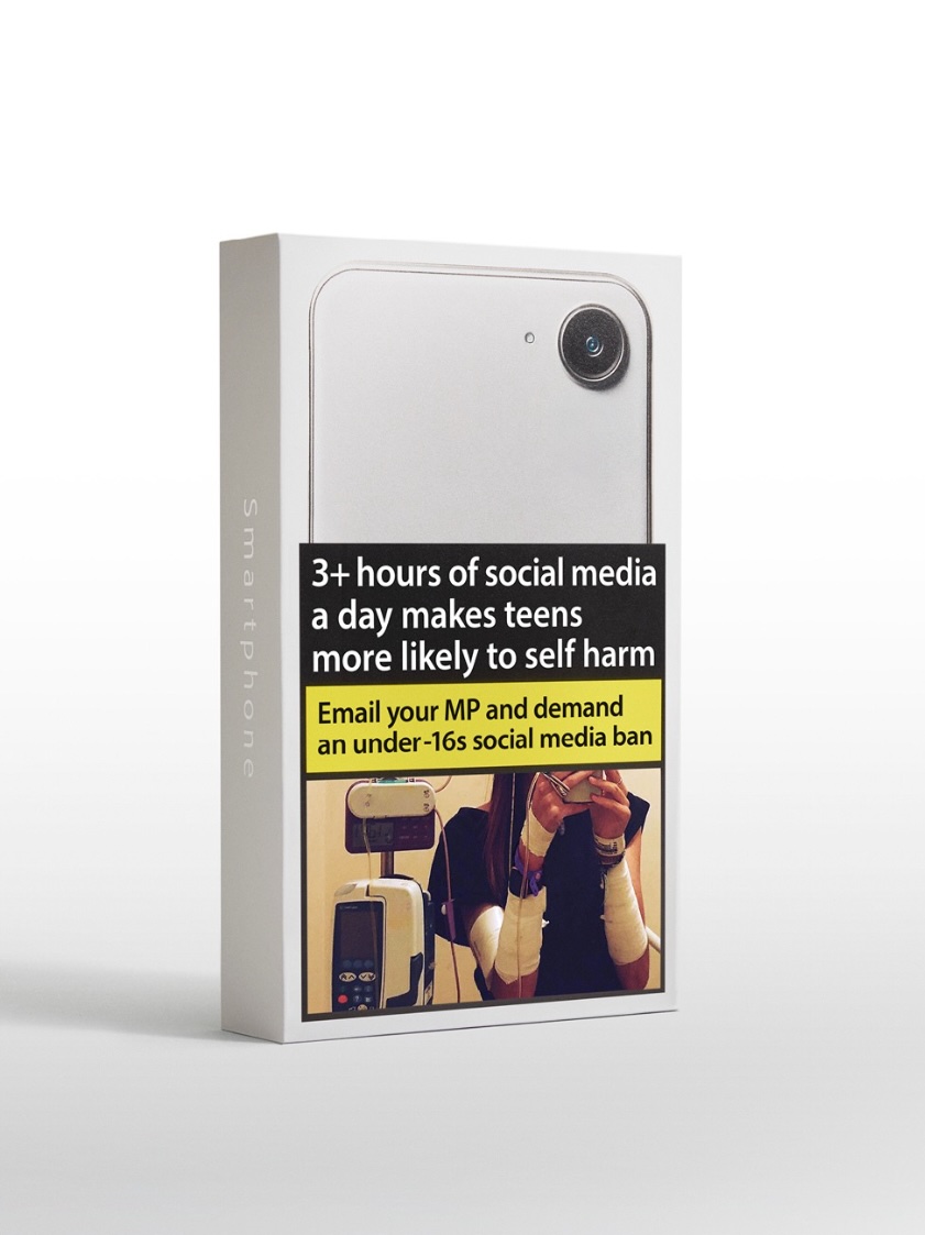 De la mano de la agencia creativa adam&eve\TBWA, ha creado una serie de gráficas con mensajes similares a los que figuran en los paquetes de cigarillos, pero en lugar de incluir los logotipos y diseños de las marcas de tabaco, muestran smartphones. Textos como “La adicción de los adolescentes al teléfono duplica el riesgo de ansiedad” o “Más de tres horas al día en redes sociales incrementa las probabilidades de autolesionarse”, se acompañan de imágenes como unas uñas mordidas al extremo, un blíster de pastillas o la foto de una joven en el hospital.