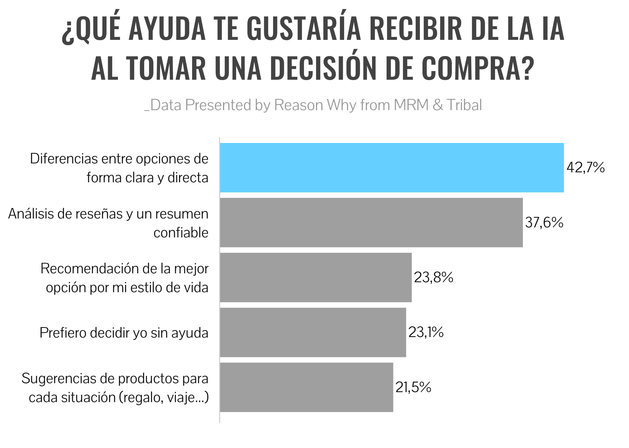 Cuando se analiza qué tipo de asistencia se valora, el 42,7% quieren que la IA explique las diferencias entre opciones de forma clara, y el 37,6% que analice reseñas y ofrezca un resumen fiable. En cambio, solo un 21,5% muestran interés en que recomiende directamente qué comprar. La preferencia mayoritaria es, de hecho, un modelo de acompañamiento. Un 55% aceptan el rol de la IA como “consejera”, mientras que solo un 2,9% estarían dispuestos a un sistema completamente autónomo. Un 29,3% prefieren que no intervenga en absoluto.