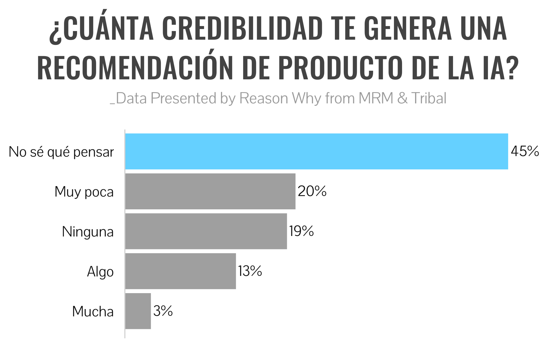 Este bajo impacto está directamente relacionado con un problema de fondo: la confianza. Casi un 40% de los consumidores no confían en las recomendaciones generadas por IA. En concreto, un 19% no le conceden ninguna credibilidad y un 20% muy poca. Frente a este bloque, solo un 16% le otorgan algo o mucha credibilidad, mientras que el grupo más numeroso -un 45%- reconocen no saber qué pensar.