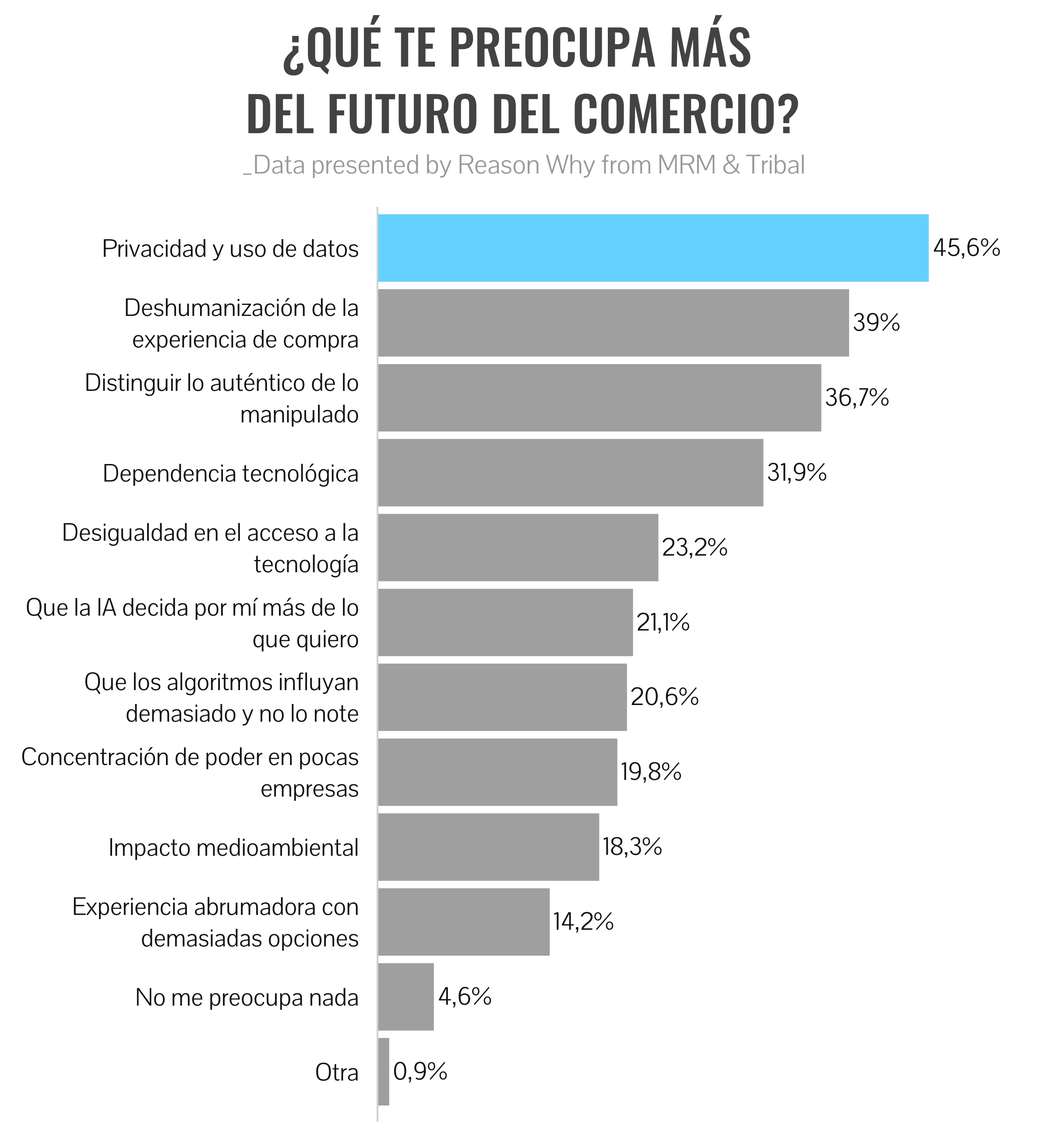 La principal preocupación es la pérdida de privacidad y el uso de los datos personales, señalada por el 45,6% de los encuestados. Le siguen la deshumanización de la experiencia de compra (39%) y la dificultad para distinguir lo auténtico de lo manipulado -como reseñas falsas o deepfakes con un 36,7%.