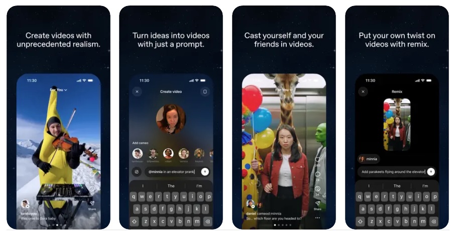La compañía acompaña la presentación de Sora 2 con una nueva aplicación social, llamada "Sora" y disponible para sistemas iOS bajo invitación en Estados Unidos y Canadá. Con ella, los usuarios pueden crear, descubrir nuevos vídeos en un feed personalizable o incluirse a si mismos o a sus amigos en vídeos. OpenAI explica que los usuarios puedes aparecer directamente en cualquier escena de Sora, lo que denomina cameos, “tras una breve grabación de vídeo y audio en la app para verificar tu identidad y capturar tu imagen”.