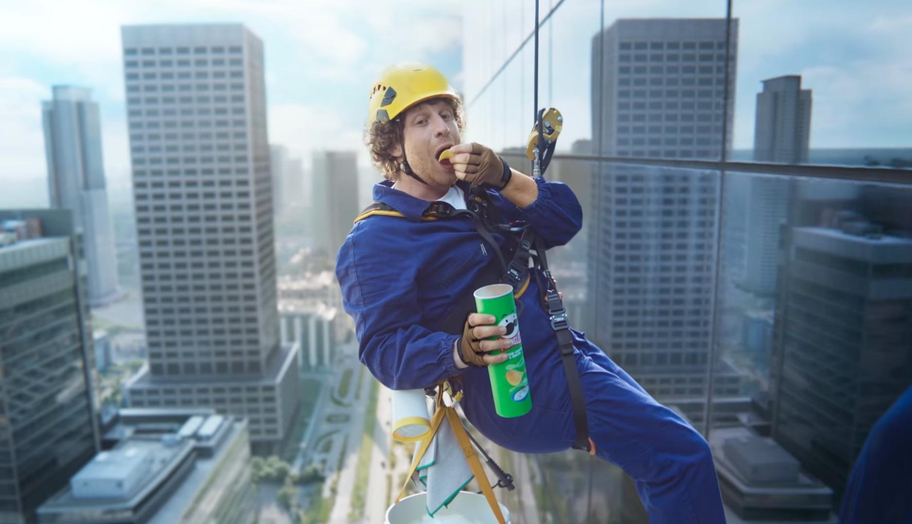 “Pass the Pringles” se ha creado junto a la agencia creativa AMV BBDO y pone el foco en el disfrute y la experiencia compartidos. Lo hace con un anuncio, con producción de Hogarth, que presenta a dos limpiacristales que en su intento de pasarse el tubo de Pringles terminan creando una magnética coreografía en el aire, dejando anonadados a los trabajadores de la oficina. Todo ello sucede al ritmo de la canción de los 80 "St Elmo's Fire (Man in Motion)", del cantante británico John Parr.