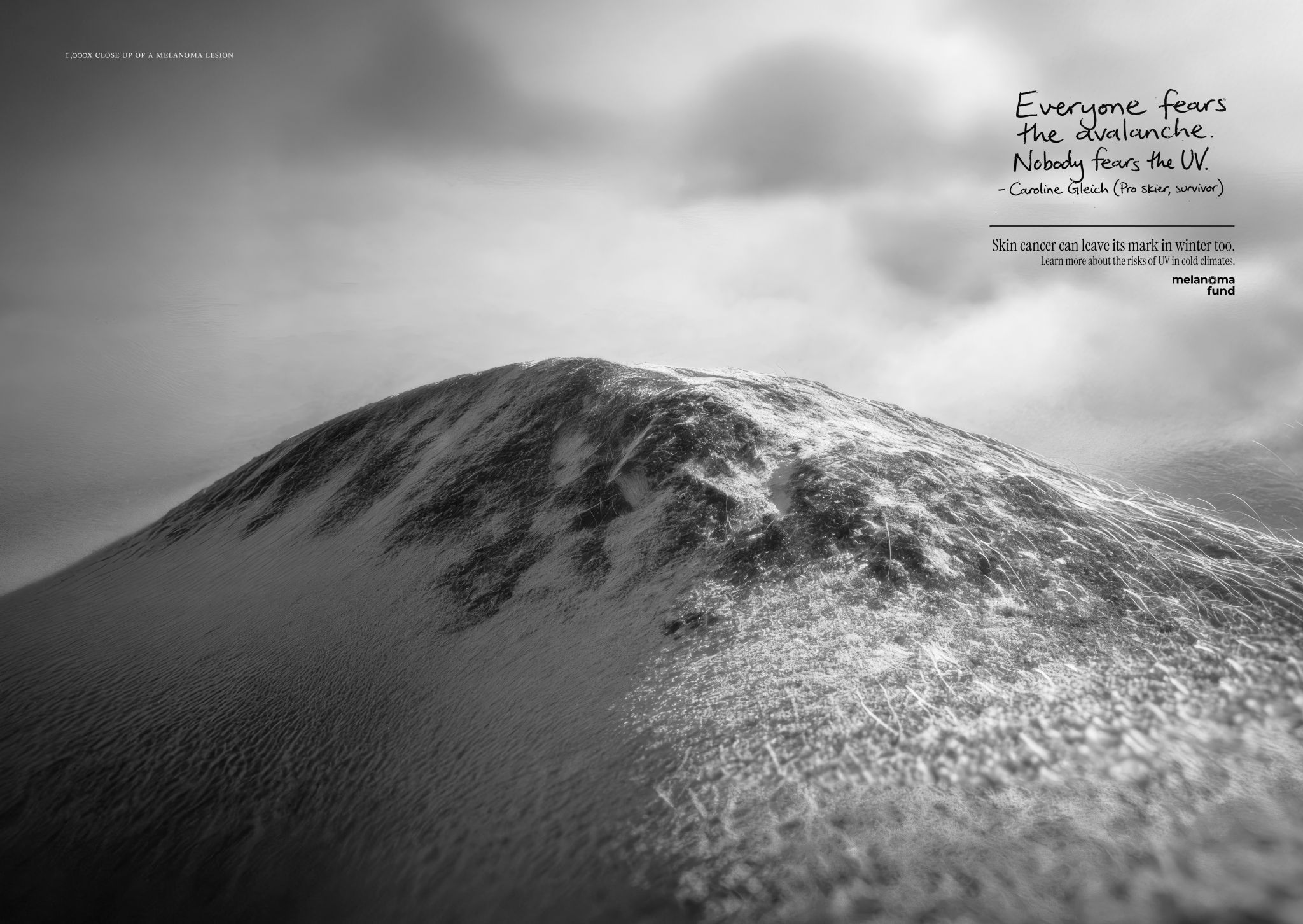 El proyecto se articula como una exposición fotográfica que, a primera vista, muestra paisajes de alta montaña. Sin embargo, al acercarse, el espectador descubre que esas imágenes están construidas a partir de melanomas reales. La campaña juega así con una doble lectura visual: lo que parece naturaleza es, en realidad, enfermedad. Un recurso que busca reducir la distancia entre causa y consecuencia en la exposición solar, especialmente en contextos donde el riesgo se percibe como bajo.