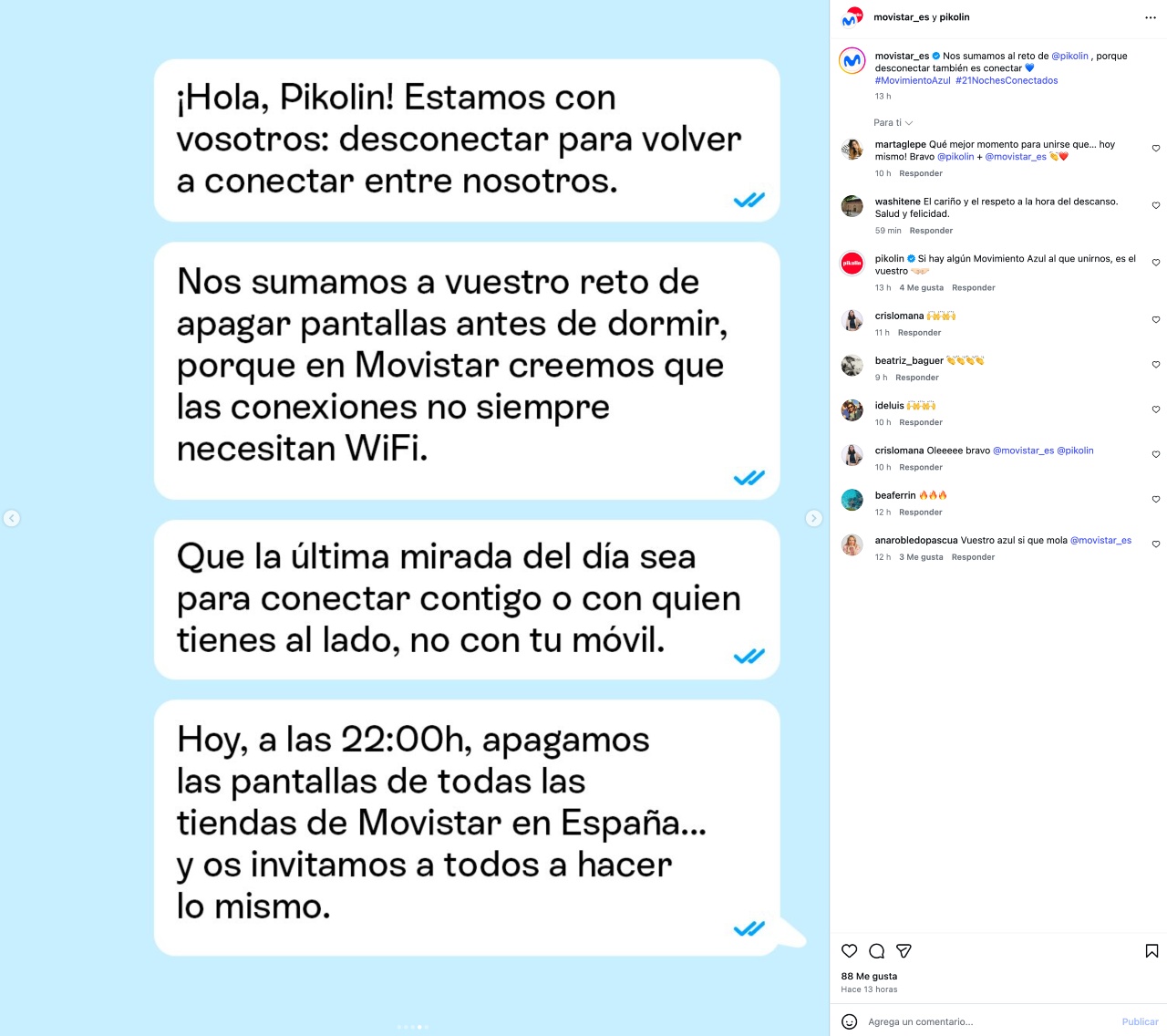 A la iniciativa del apagón de Pikolin en Callao se sumó Movistar a través de Movimiento Azul, su plataforma orientada a promover un uso responsable y consciente de la tecnología. En paralelo al apagado simbólico de Pikolin en el centro de Madrid, la compañía apagó las pantallas de todas sus tiendas en España a partir de las 22:00 horas.