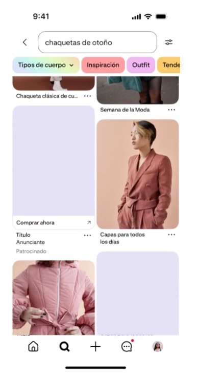 Pinterest pretende seguir posicionándose estratégicamente en torno la búsqueda y ha presentado nuevas soluciones publicitarias con foco en lo visual para captar la atención y promover la acción del usuario. Entre ellos, apuesta por anuncios de la parte superior búsqueda, ya que según datos de Pinterest, el 45% de los clics se producen en los diez primeros espacios de los resultados de búsqueda.