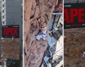 Charlize Theron escala una valla publicitaria para promocionar la película de Netflix “Apex”
