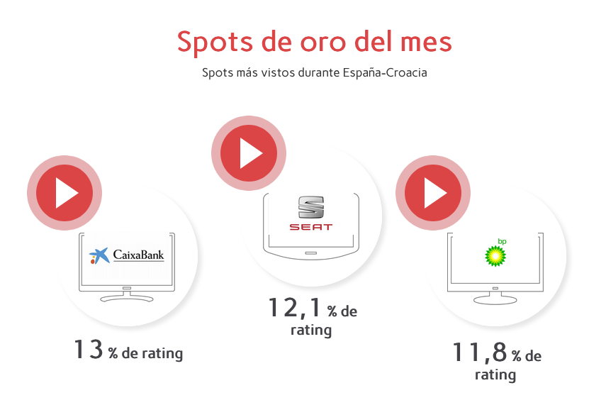 Si nos fijamos en los spots más vistos del mes, los primeros puestos los ocupan los pases emitidos durante el partido entre España y Croacia de la competición "UEFA Nations League". Caixabank, Seat Arona y BP carburantes ocupan los primeros puestos con 13%, 12,1% y 11,8% respectivamente.