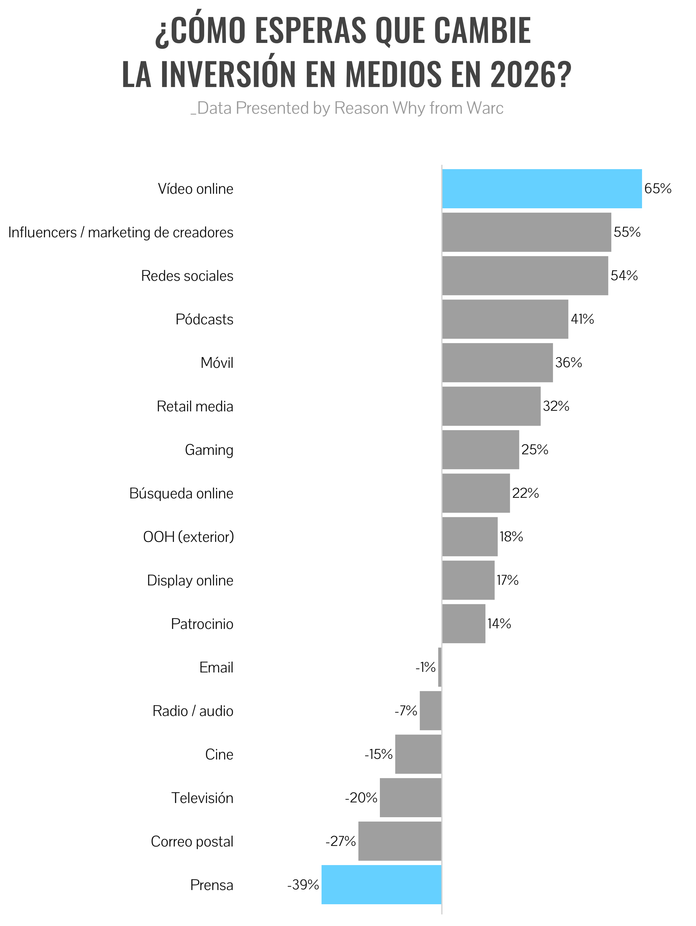 Dentro de este contexto, la mayoría de responsables de marketing prevén incrementar su inversión en vídeo online, marketing de influencers/creadores y redes sociales, consolidando un mix donde lo digital concentra tanto la presión de rendimiento como la experimentación con nuevos formatos.