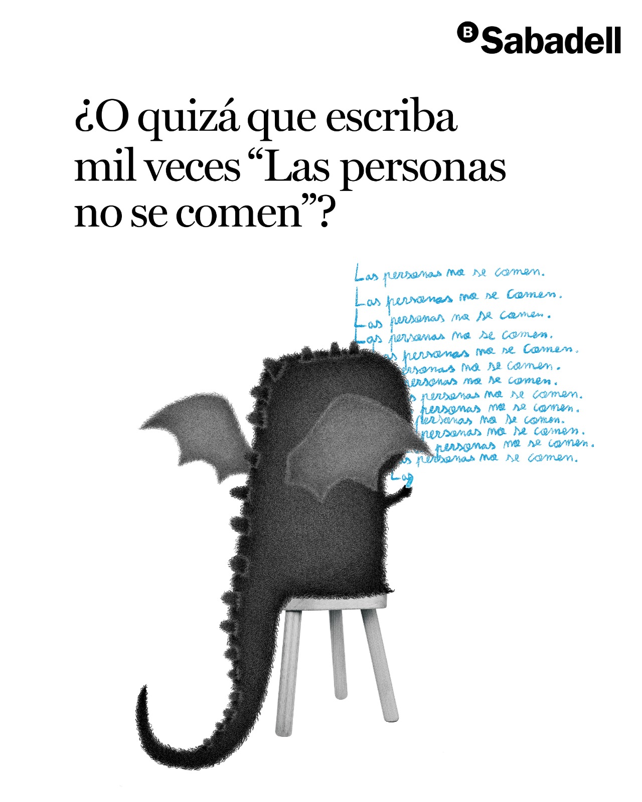 Los finales alternativos para la leyenda del dragón de Sant Jordi, que eran metáforas del rechazo del Sabadell a la OPA, se presentaron con unas gráficas ilustradas por el artista Luis Coelho que vieron la luz en redes sociales y publicidad exterior. Así, se mostraba al dragón escribiendo mil veces “Las personas no se comen” en una pizarra, sosteniendo libros con los brazos en cruz o abrazado a un cohete camino del espacio exterior. Además, a través de una landing dedicada interactiva, los usuarios pudieron navegar por los diferentes finales alternativos para el personaje.