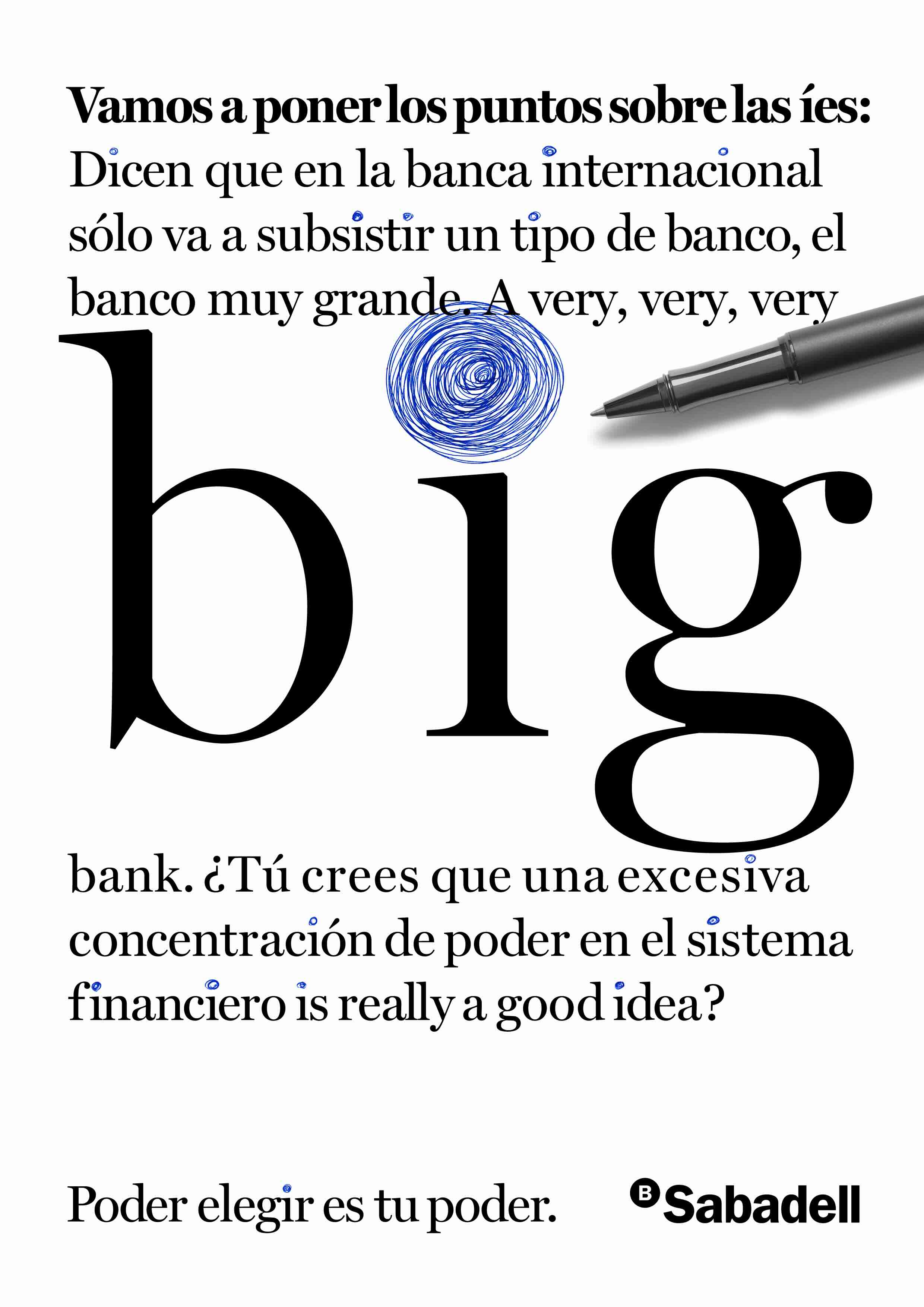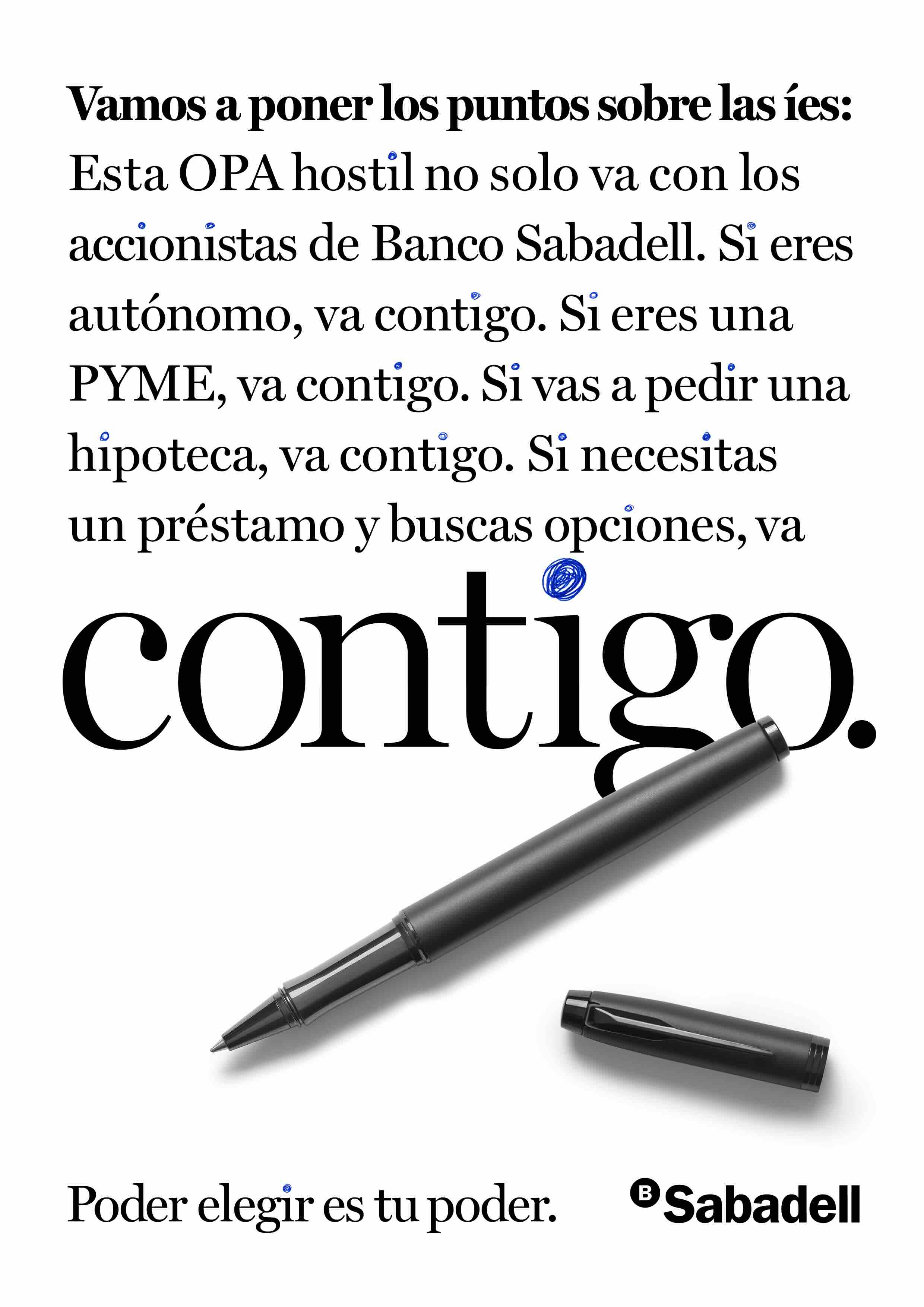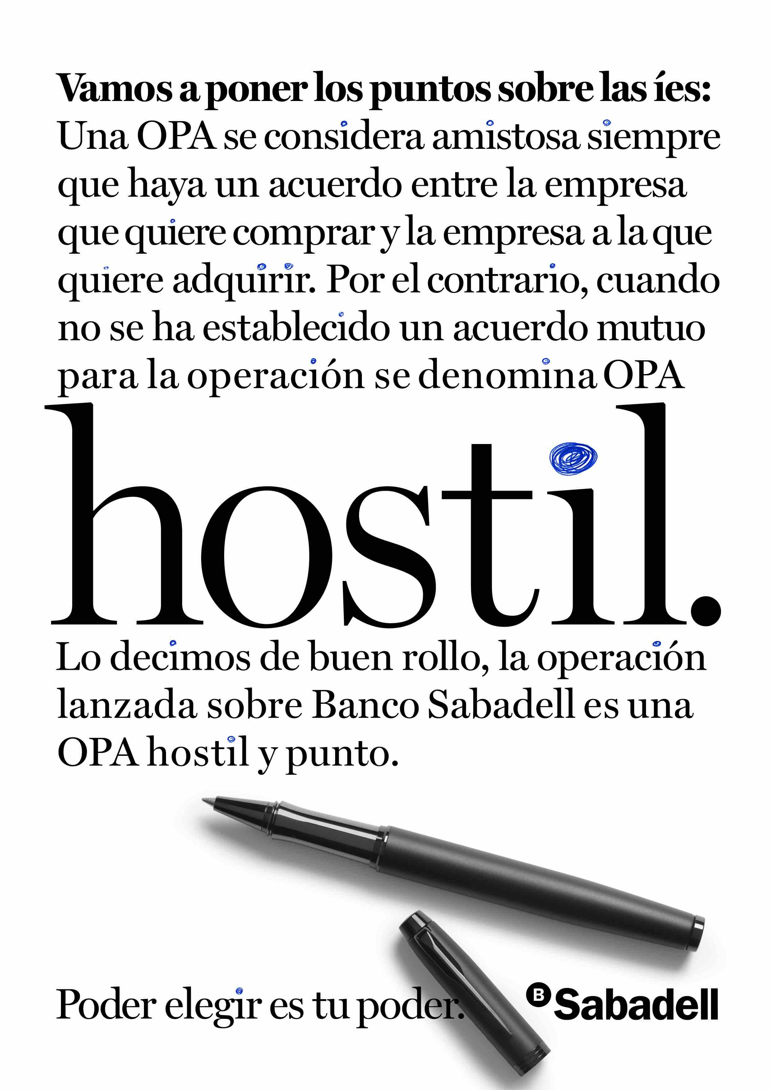 Además de la propuesta audiovisual, la campaña contó con una serie de piezas gráficas que daban protagonismo a los copys y resaltaban palabras concretas vinculadas, tanto al carácter hostil de la operación, como a los valores del Sabadell. Las creatividades, de estilo minimalista, tenían el punto de la letra ‘i’ escrito con tinta de bolígrafo como protagonista.