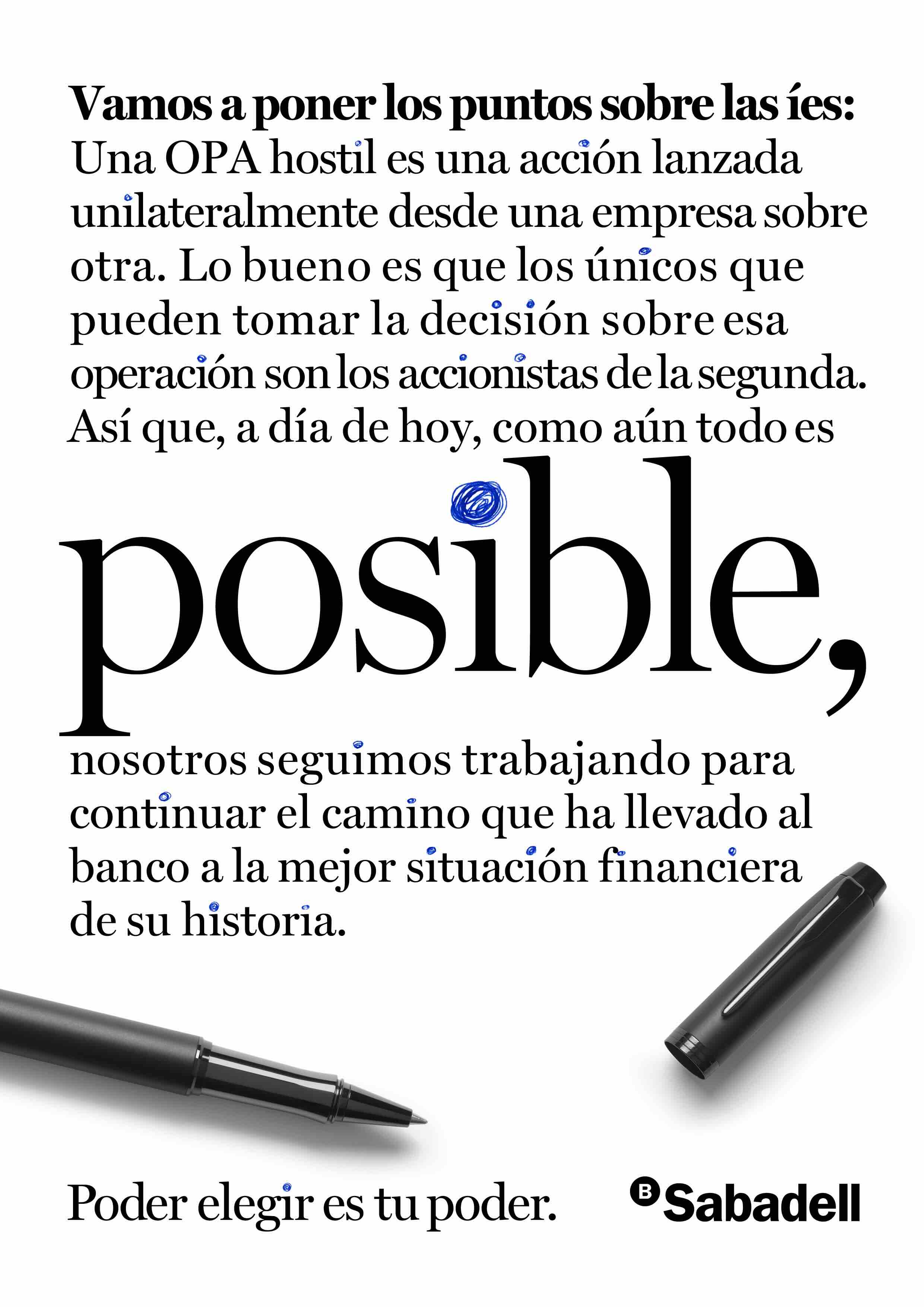 Más adelante, la postura de rechazo de la entidad a la operación empresarial se expresó con el lanzamiento de “Los puntos sobre las íes”, una campaña que recurría a la expresión popular para poner de manifiesto, de manera clara, las distintas implicaciones de la OPA hostil y la posición de rechazo del Sabadell al respecto. En esta respuesta que daba el banco a la oferta del BBVA también se destacaba que, pese al intento de adquisición, la entidad estaba atravesando la mejor situación financiera de su historia.