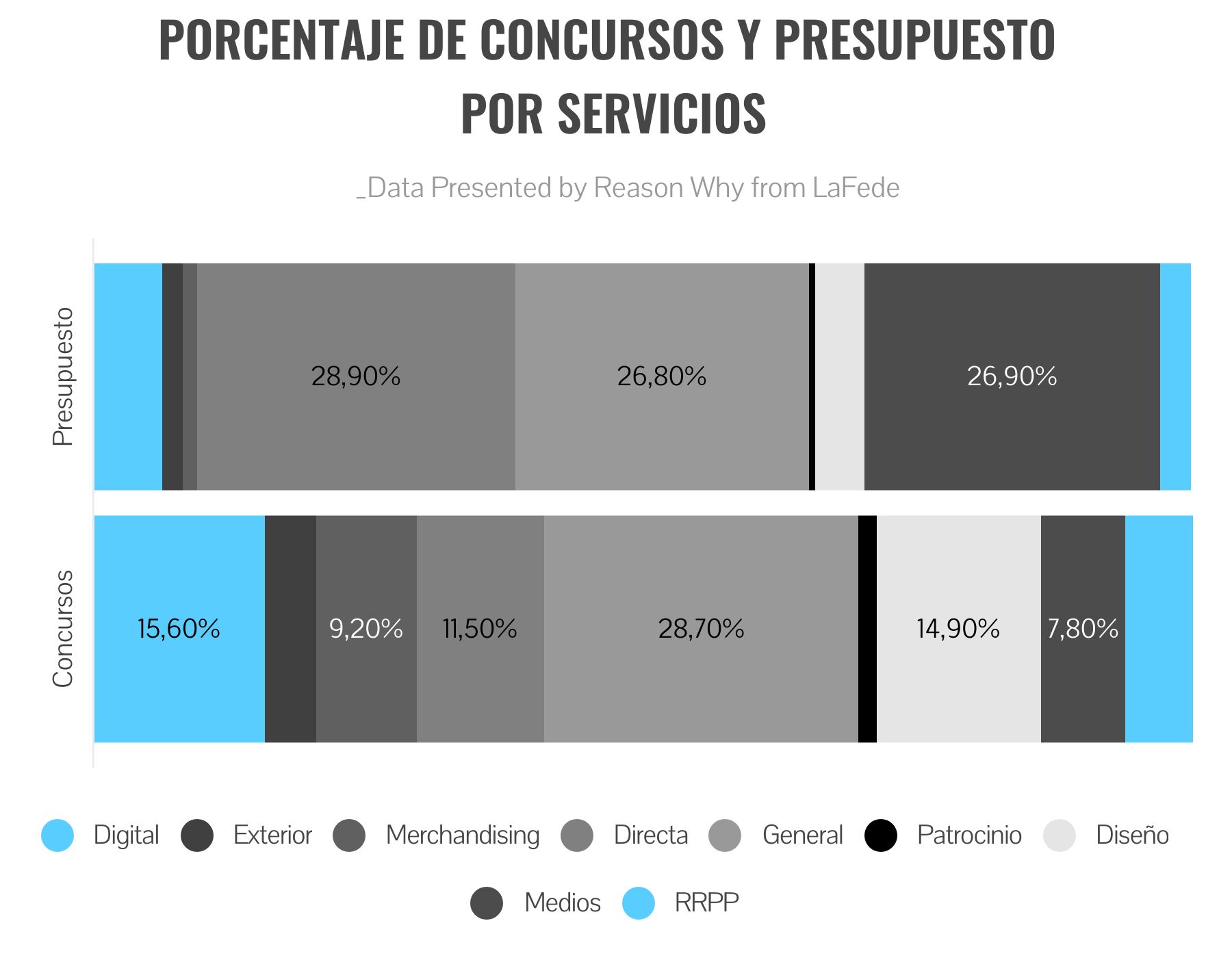 Publicidad general fue el área para la que se convocaron más concursos, con 939, seguido de Digital, con 510, y Diseño y Edición, con 487. Sin embargo, en términos de presupuesto, este se concentró en el apartado de Publicidad Directa (376 concursos) con 358,5 millones de euros. Le siguen Medios (254 concursos), con 333,1 millones; y Publicidad general, con 332,7 millones de euros.