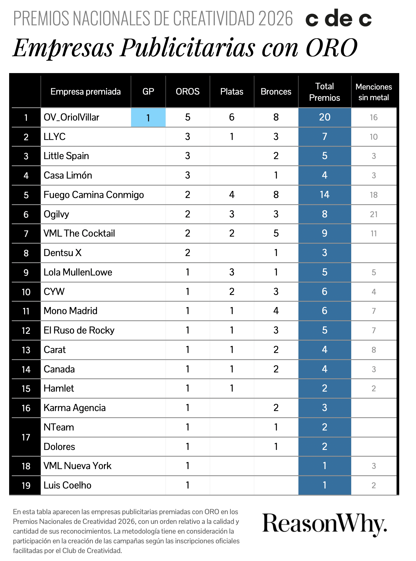 Las cinco agencias son las que encabezan el Palmarés en relación a la conjugación del valor y cantidad de metales obtenidos en los galardones convocados por el Club de Creatividad. En primera posición se sitúa Oriol Villar al haber logrado 20 galardones, entre ellos el Gran Premio y 5 Oros; seguida de Fuego Camina Conmigo, con 14 trofeos, 2 de ellos Oros. No obstante, atendiendo al conjunto de empresas publicitarias premiadas, y no sólo agencias, Little Spain ocupa el tercer lugar con 5 premios, siendo tres de ellos Oros.