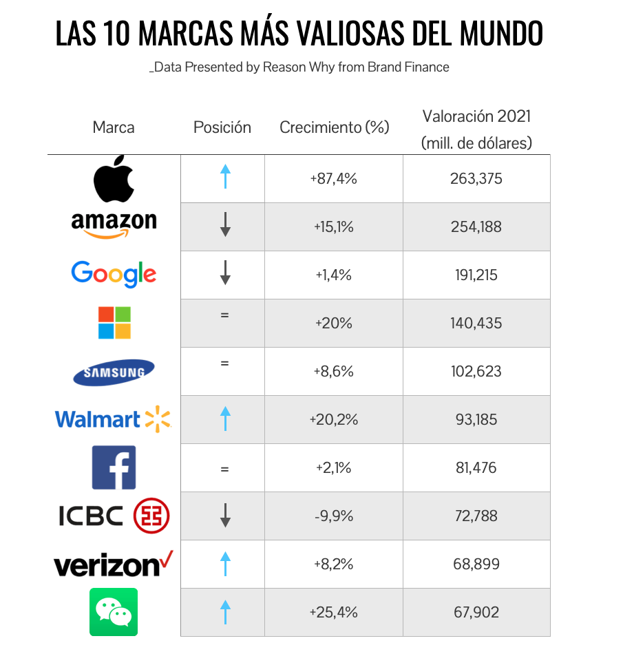 Asimismo, a pesar de perder la primera posición de la tabla, Amazon aparece en el segundo puesto y ha logrado un crecimiento saludable en valor de marca, registrando un aumento del 9%. Y es que el gigante minorista es una de las pocas marcas que se ha beneficiado considerablemente de la pandemia.