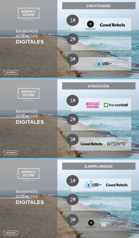 En el caso de las especialistas digitales, Good Rebels (antes Territorio Creativo) es la única que aparece en los tres rankings, en dos de ellos en primera posición (Creatividad y Ejemplaridad), seguida por Double You, Sr. Burns y Wysiwyg que aparecen en dos de ellos. Double You y Sr. Burns comparten con Good Rebels el primer lugar en Creatividad, y Ejemplaridad respectivamente. El de Atracción, lo lideran Social Noise y The Cocktail.