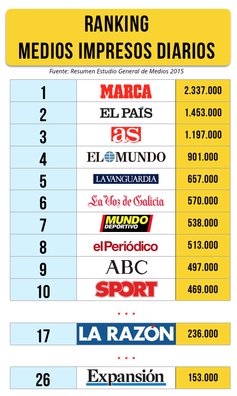 Aunque no sólo echamos en falta cabeceras en el apartado digital. Hay otras, como Cinco Días o El Economista, que no figuran en el análisis de medios impresos. Y también hay una razón: en el EGM sólo se analizan los diarios que cuentan con más de 60.000 lectores.