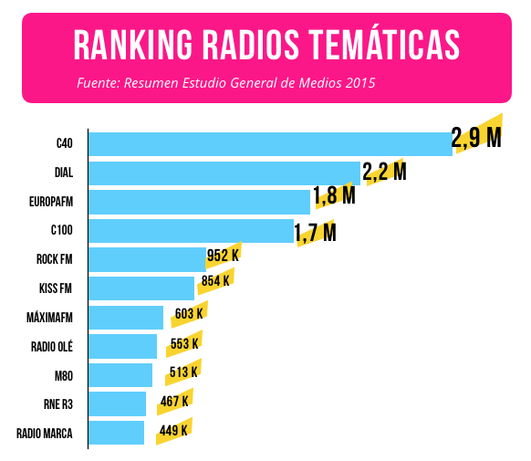 Así pues, la cifra total de oyentes de radio generalista asciende a 11,3 millones. Aunque si nos fijamos en los datos de las radios temáticas este número es incluso mayor, llegando a los 14 millones y medio. Y los líderes del ranking son Los 40, Cadena Dial y Europa FM.