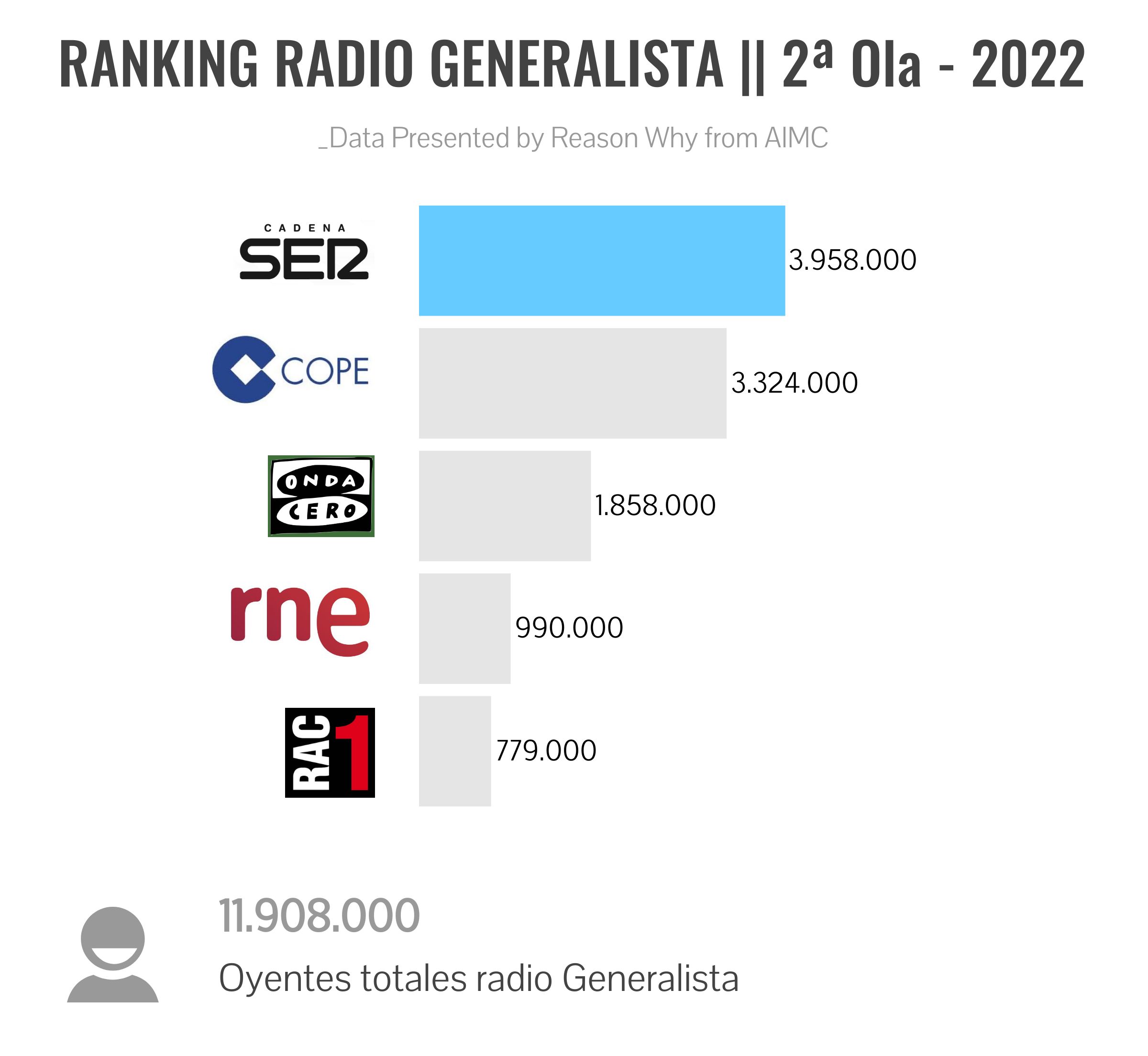 El estudio ofrece un ranking de medios radiofónicos generalistas muy similar al de otras ediciones y, en este sentido, Ser, Cope y Onda Cero continúa liderando como las emisoras más escuchadas en nuestro país. Según AIMC, 11,9 millones de personas escuchan la radio generalista en España.