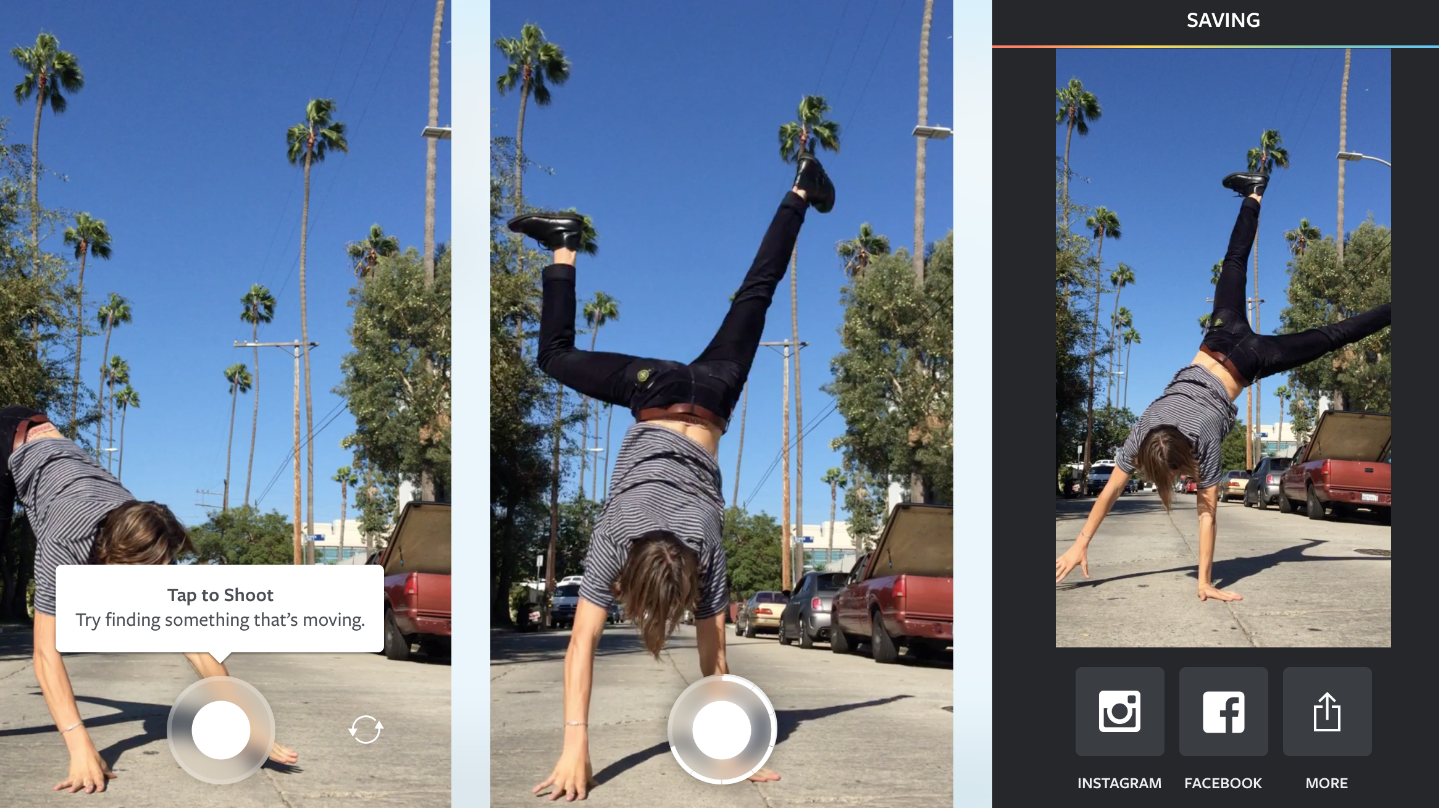 Por ejemplo, Boomerang permite captar el momento en que un amigo salta desde un trampolín para que después el usuario pueda observar cómo vuela hacia atrás y hacia adelante en el aire.