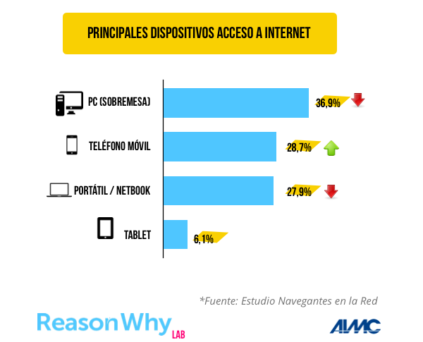 Sin embargo, al preguntar por los dispositivos desde los que se conectan a Internet (no sólo por los que consideran más importantes), se observa que el teléfono móvil es utilizado por el 93,9% de los internautas, por delante del ordenador portátil (76,1%) y del ordenador de sobremesa (71,4%).