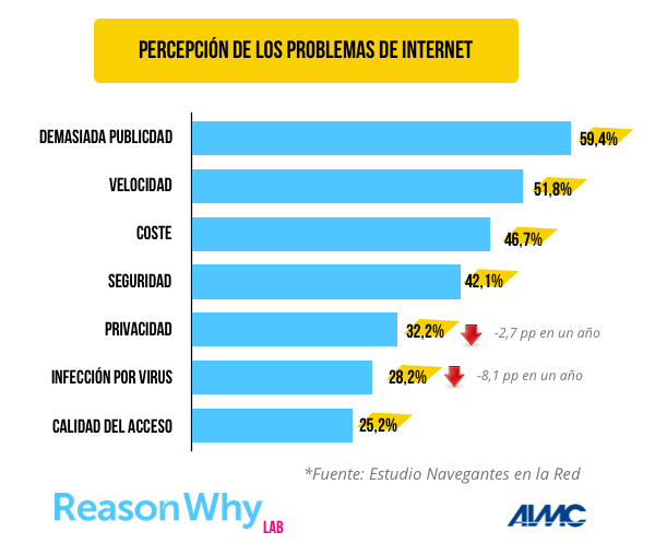 El principal escollo que encuentran los internautas al a hora de navegar por la Red continúa siendo la “demasiada publicidad”, opción escogida por el 59,4% de los encuestados y cifra similar a la registrada en 2014.