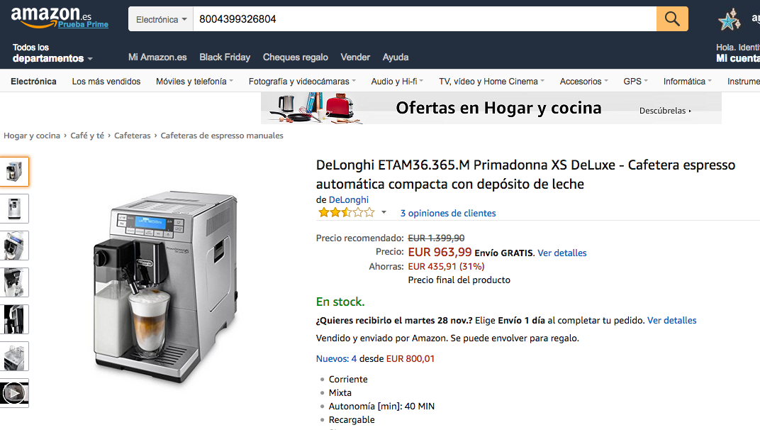 El estudio ha detectado importantes diferencias de precios en algunos de los productos analizados, aproximándose en algunos casos hasta casi el 50% como pasa con la Cafetera espresso automática De’Longhi vemos como la diferencia es de 435€, un 45,13%.