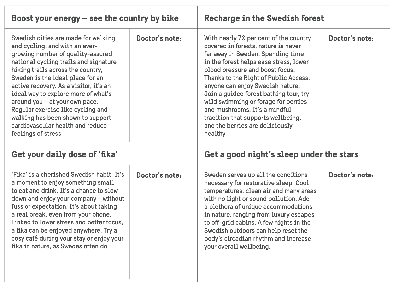 Visit Sweden ha trabajado junto a la profesora e investigadora sueca Yvonne Forsell, especializada en medicina social, para desarrollar un documento descargable que puede presentarse a un médico. El archivo -presentado como una prescripción médica real- propone actividades vinculadas al entorno natural, la cultura y la interacción social, elementos ampliamente estudiados por la ciencia como beneficiosos para la salud integral.