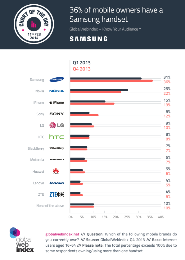 Si a comienzos de 2013 el 31% de la población mundial tenía un dispositivo móvil Samsung, a finales de año esa cifra aumentó hasta un 36%. Son datos del último estudio de Global Web Index sobre la penetración de smartphones en todo el mundo.