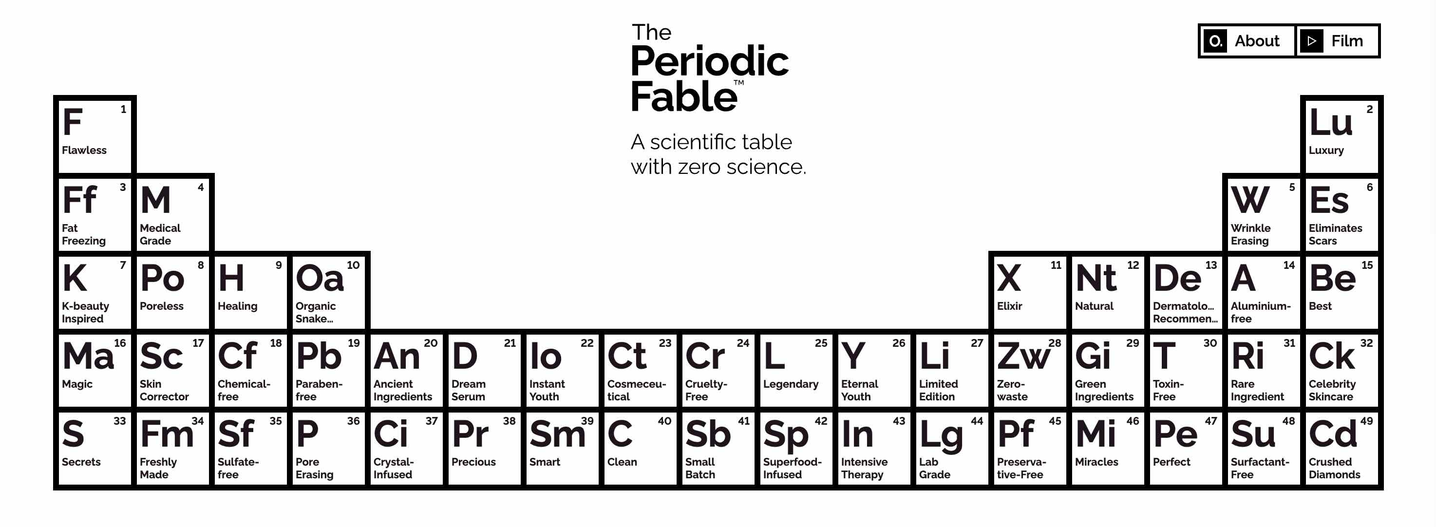 Así, la campaña presenta The Periodic Fable (traducible como El cuento periódico), una tabla periódica con cero base científica, según señalan desde la marca, compuesta por 49 términos populares de marketing. Recogidos en un gráfico interactivo, The Ordinary explica cada uno de los conceptos tratando de arrojar luz sobre ellos bajo un enfoque divulgativo.