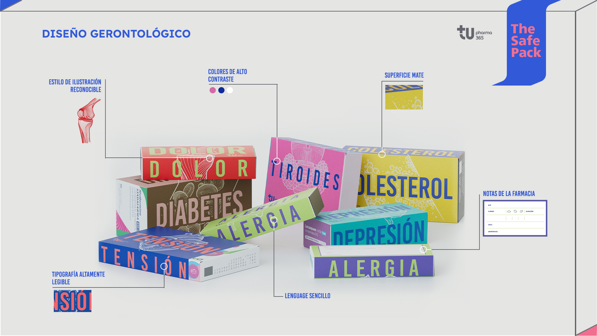 El desarrollo de la solución parte de un análisis de los medicamentos más prescritos en España, que evidenció una alta homogeneidad en dimensiones, colores y estilos gráficos. A partir de ese diagnóstico, el equipo aplicó principios de diseño gerontológico, orientados a adaptar productos a las capacidades cognitivas y visuales de las personas mayores, trasladando estos criterios al ámbito farmacéutico.