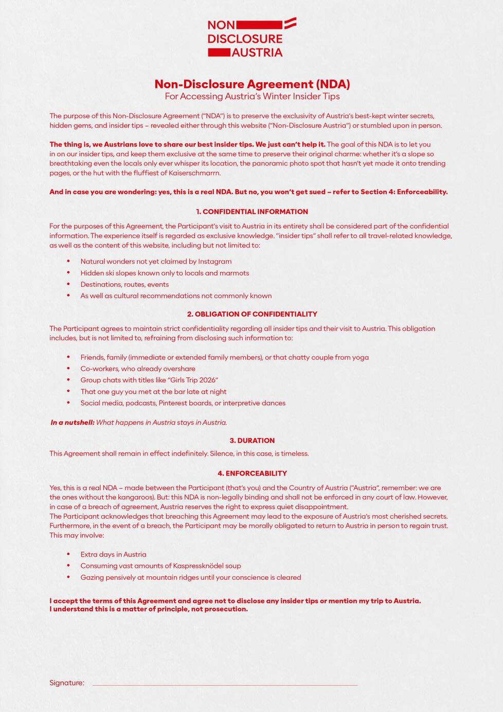 Junto a la agencia Wien Nord Serviceplan ha desarrollado “Non Disclosure Austria”, basada en el concepto de los acuerdos de confidencialidad, conocidos en el terreno empresarial internacional como “Non Disclosure Agreements” (NDAs). La campaña solicita a los turistas que firmen el acuerdo de cara a tener acceso a consejos exclusivos de auténticos austriacos para visitar el país. Además, también pide que guarden en secreto dichos tips y su experiencia de viaje, bajo la idea “lo que sucede en Austria, se queda en Austria”.