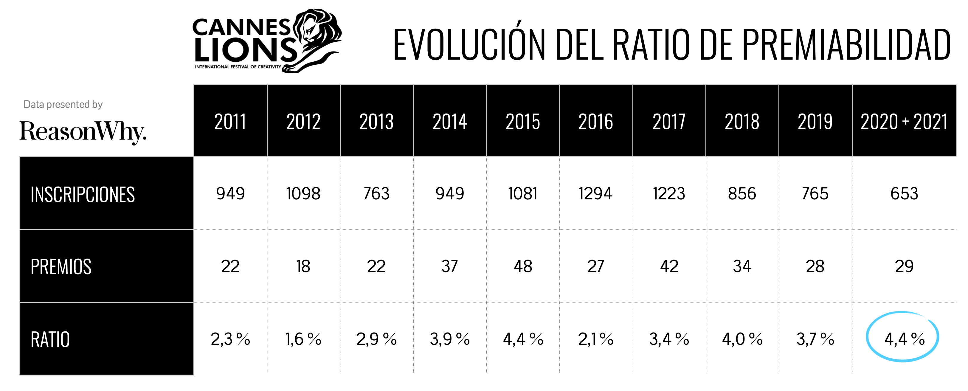 Con estos datos podemos comprender el nivel de competitividad y el grado de reconocimiento que aporta el Festival de Cannes Lions a los trabajos españoles presentados en cada edición.